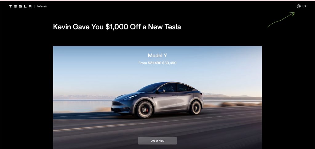 After clicking the Tesla referral link you’ll land on a page that looks like this where you can scroll down to see Model S, Model 3, Model X or Model Y all with the same discount (S3XY!). at the top you’ll also see at the top right the button to change to your locale so that you can get the correct discount applied: